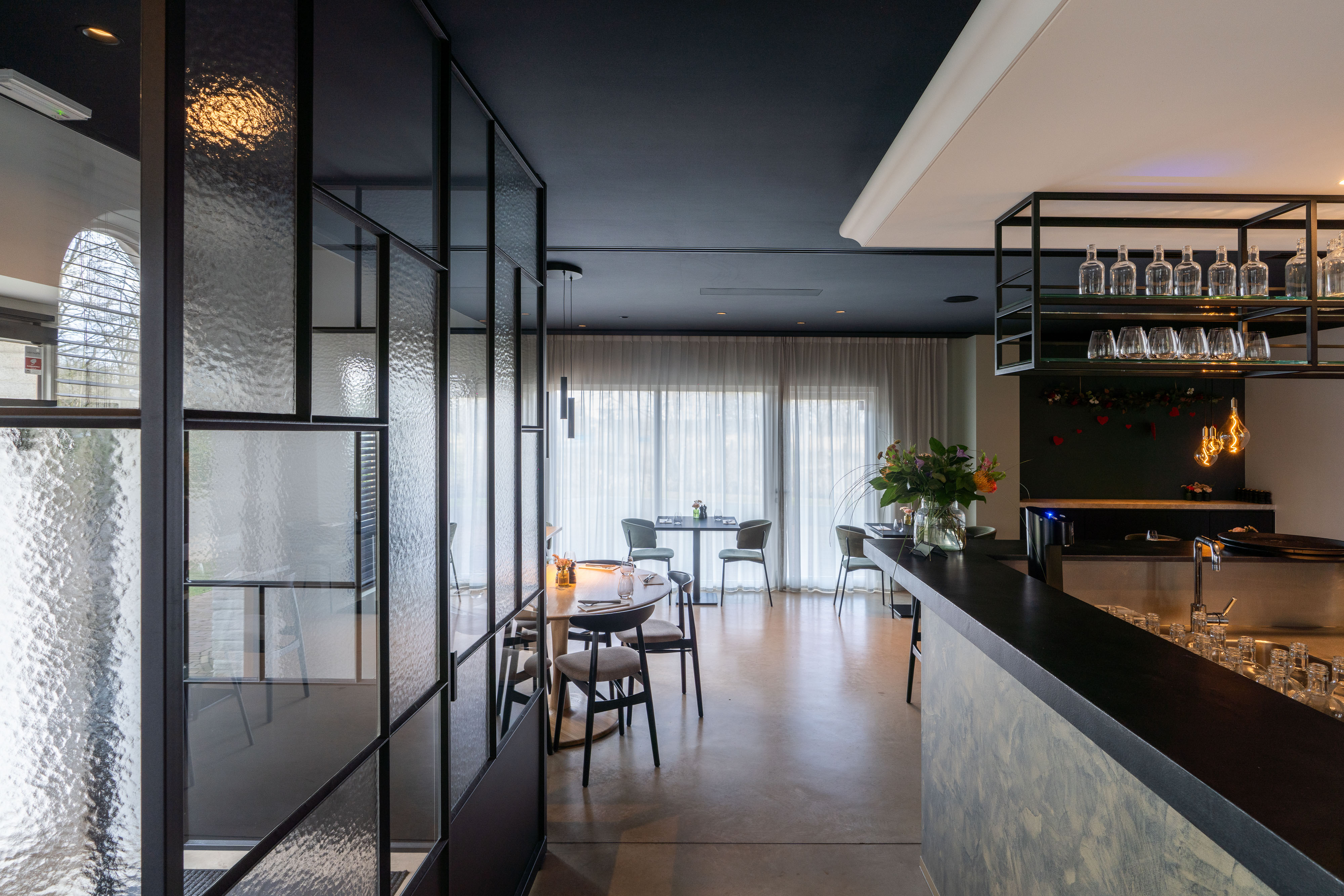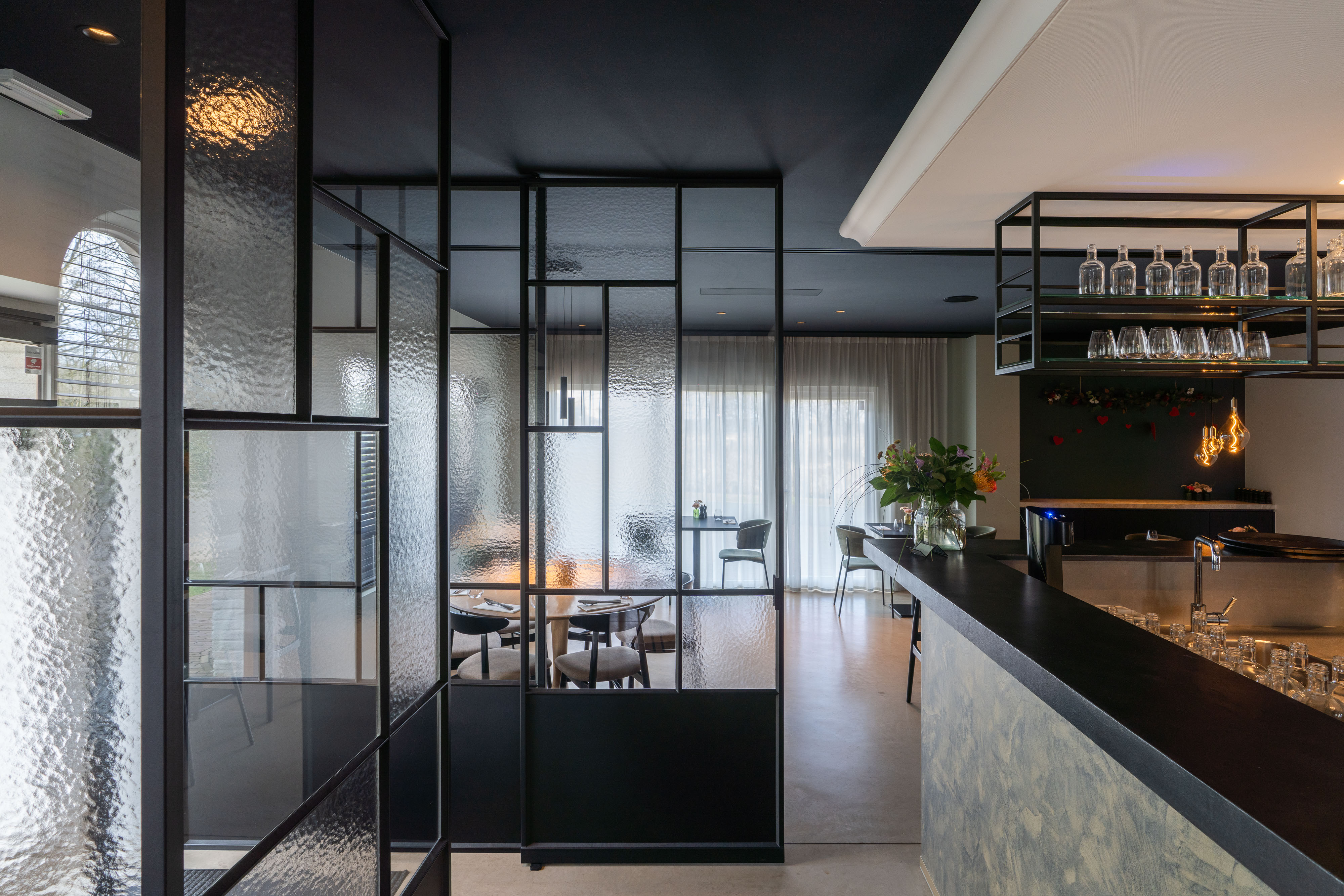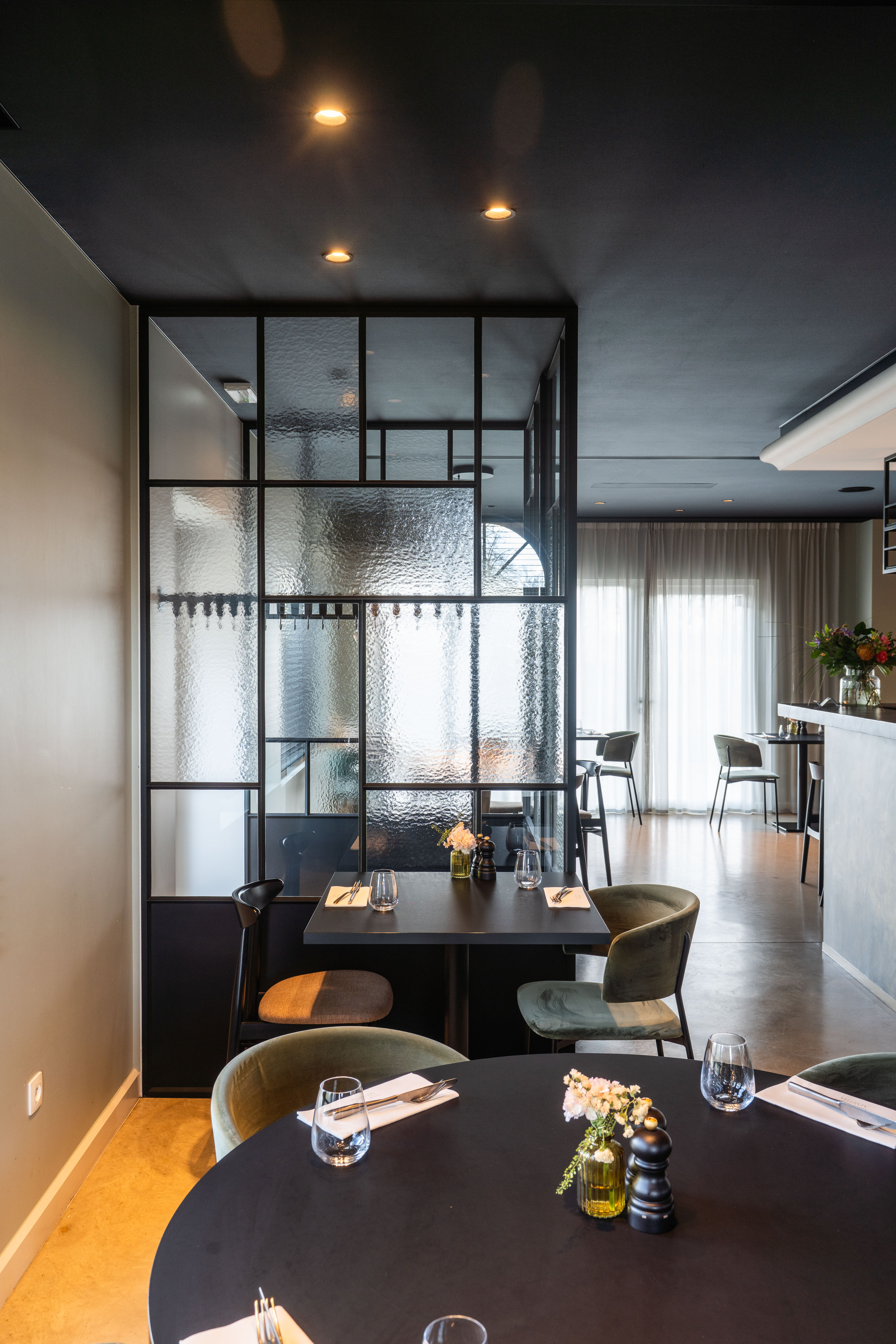 Om de inkom elegant af te scheiden van het restaurantgedeelte, realiseerden we een volledige stalen wand met een pivotdeur. Dit zorgt voor een strakke, moderne uitstraling en biedt tegelijkertijd een subtiele overgang tussen de twee ruimtes.