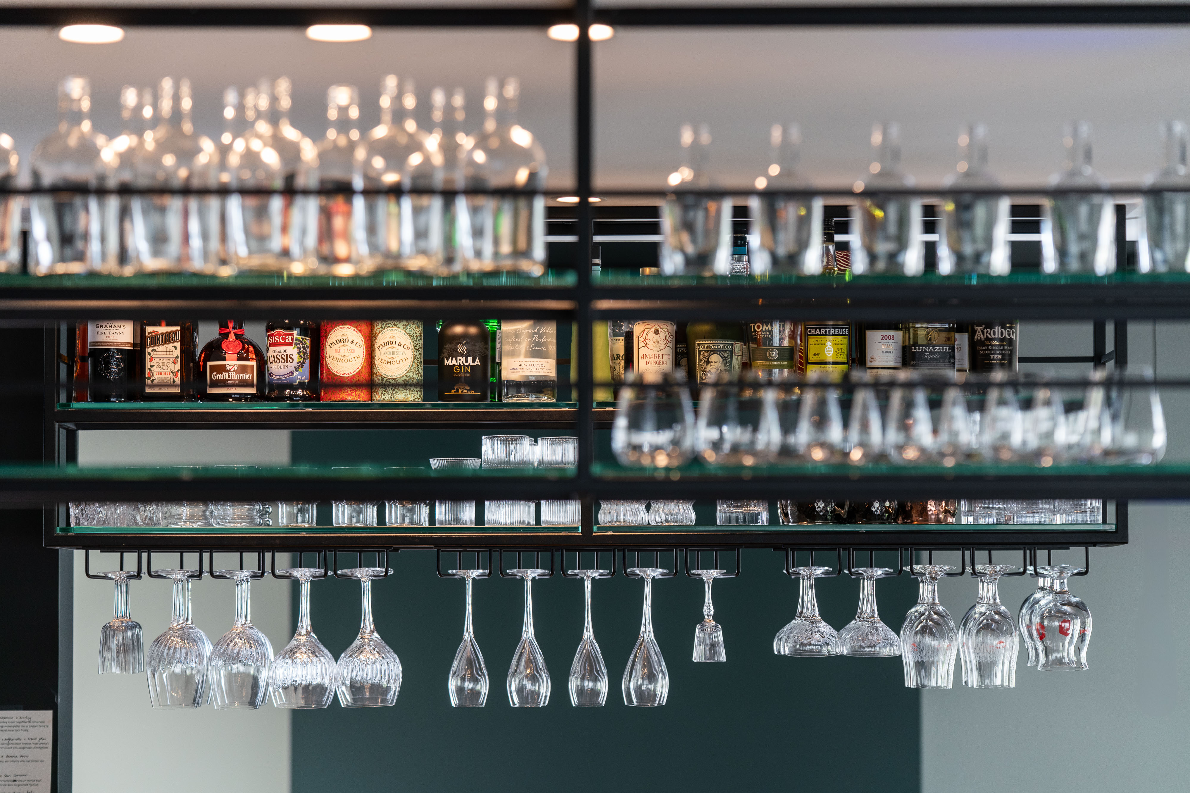 Daarnaast vernieuwden we de bestaande houten deuren met nieuw glas, waardoor ze een frisse uitstraling kregen en meer lichtinval bieden. Boven de toog plaatsten we een op maat gemaakt hangrek voor de glazen en in de inkom creëerden we een stalen kapstok voor een nette, uitnodigende sfeer bij binnenkomst.