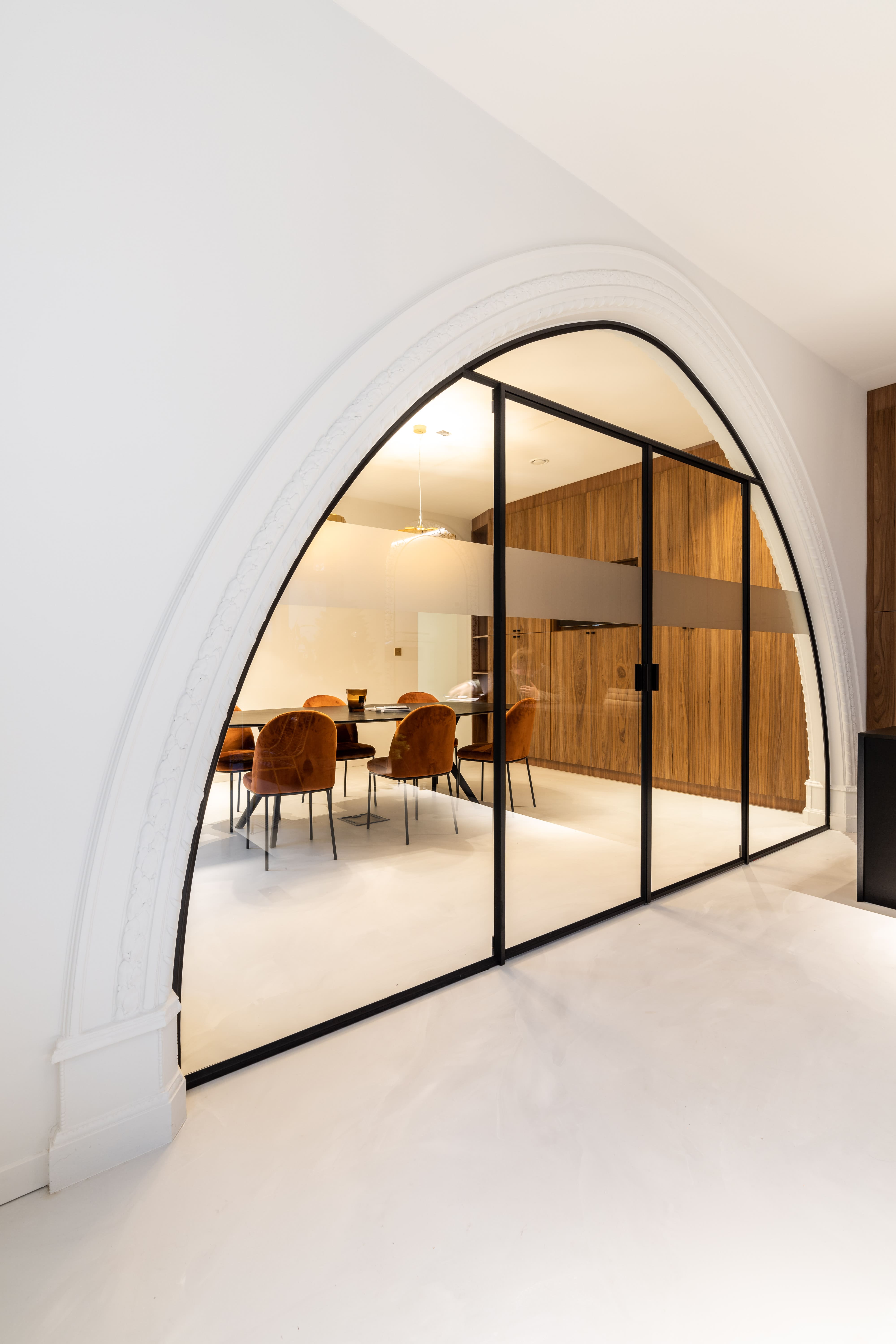 Elegantie met kroonlijsten en stalen deuren in boogvorm