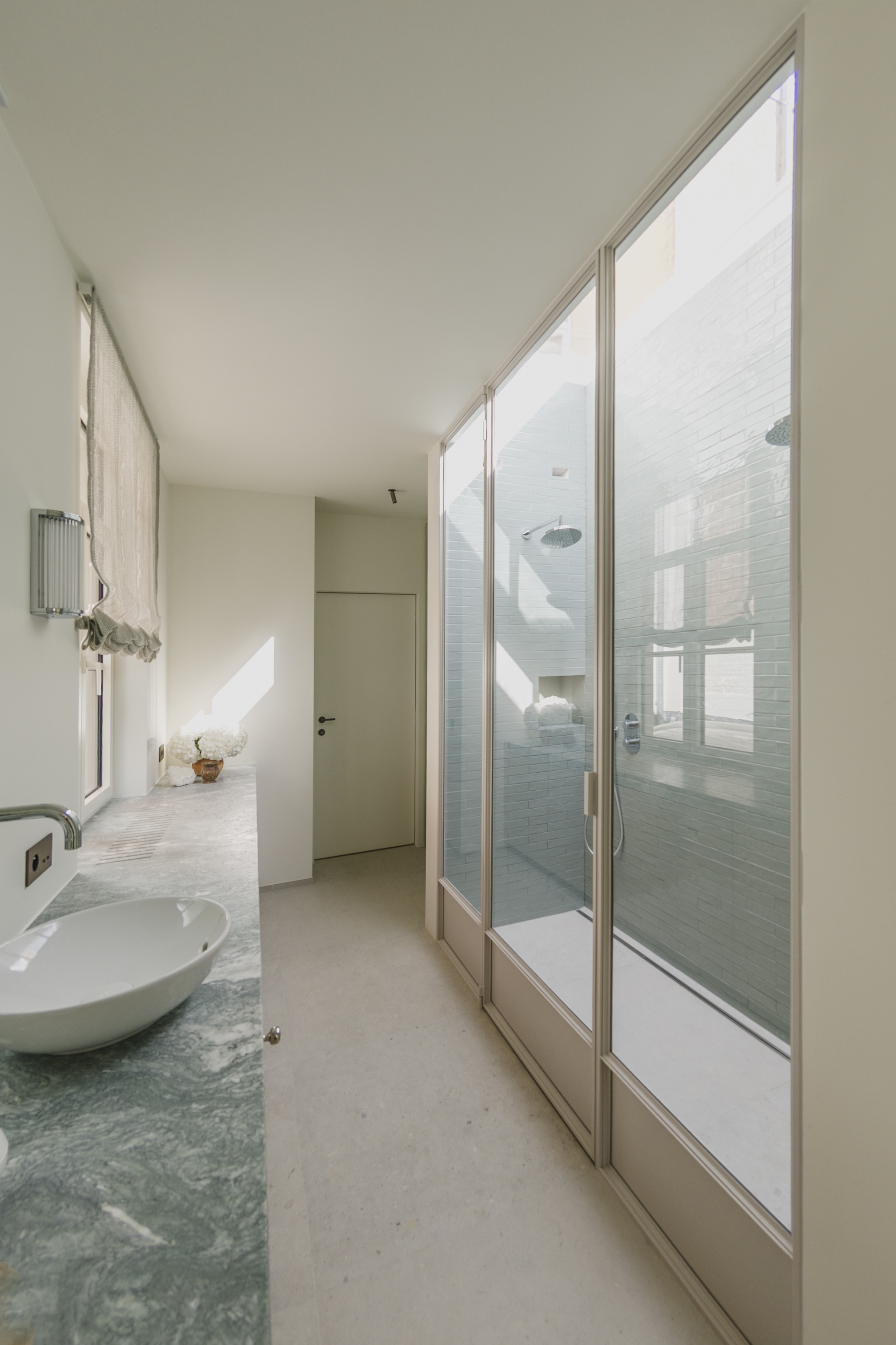 Het zachte NCS kleur van de deur met vaste zijlichten past perfect in het evenwichtige kleurenpallet.