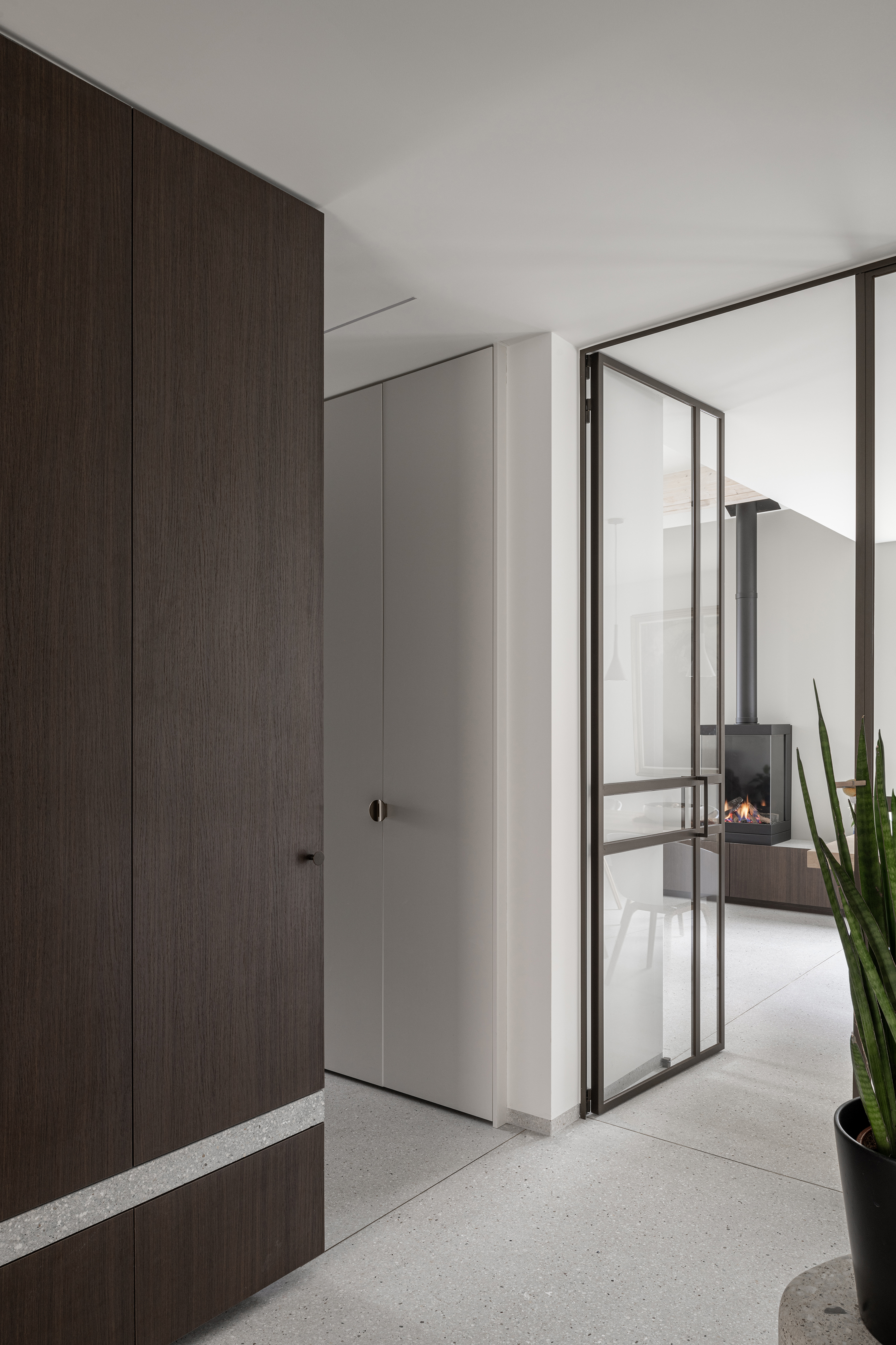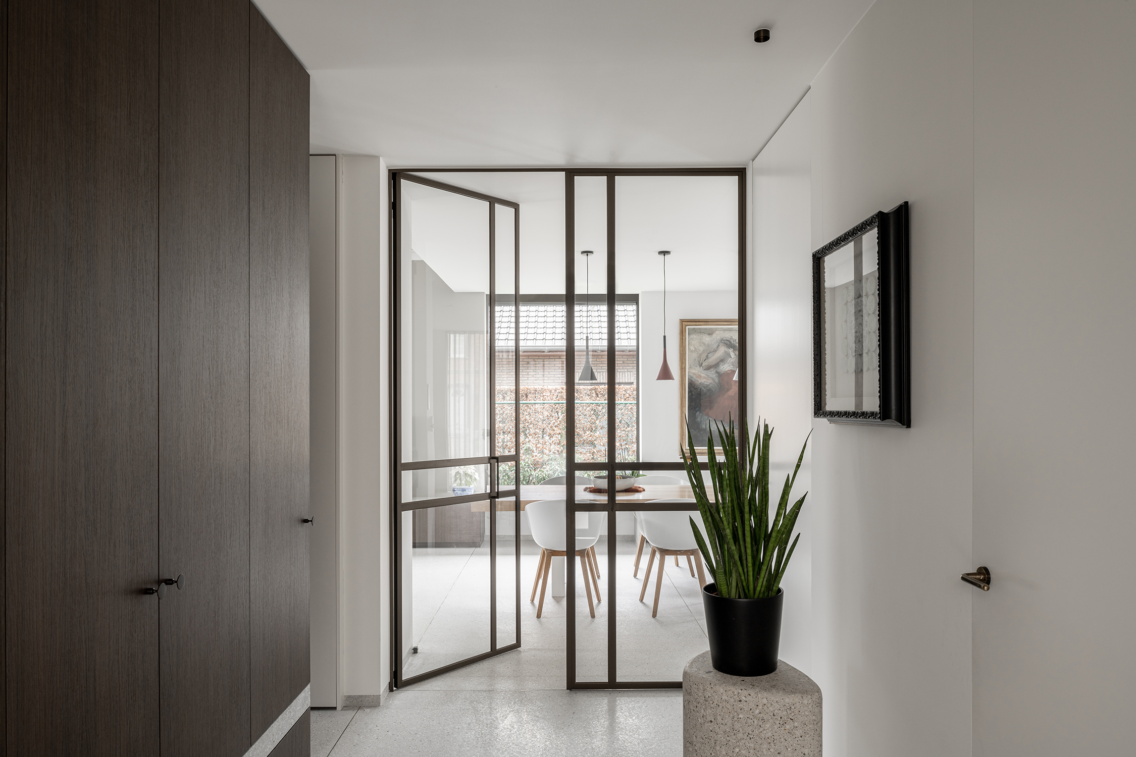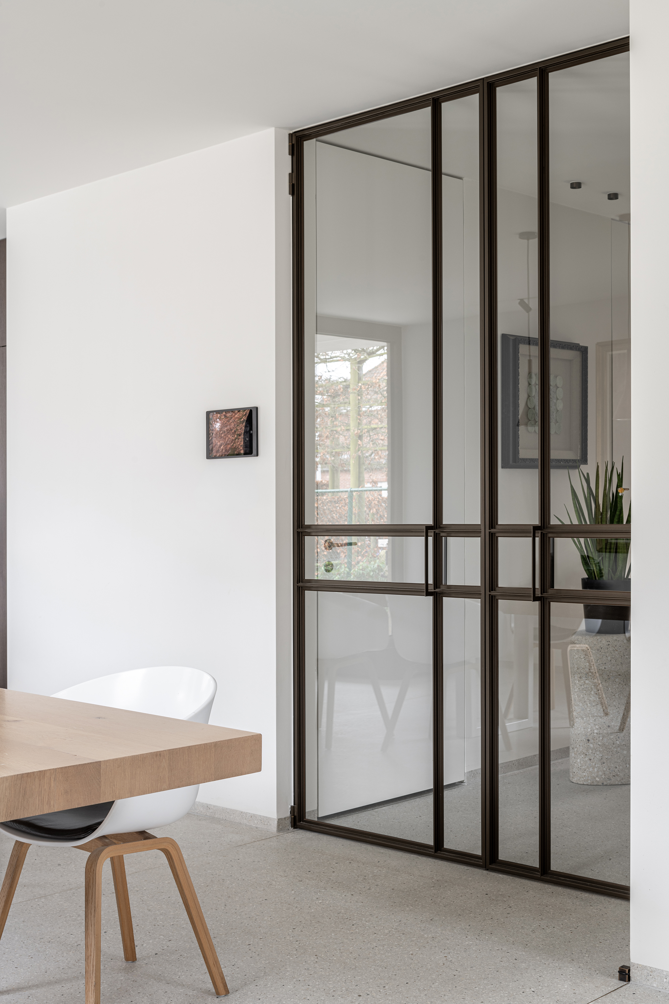 In de inkom- en leefruimte plaatsten we een dubbele deur, die de ruimtes op een stijlvolle manier verbindt. In de badkamer zorgden we voor een toegangsdeur van de gang naar de badkamer, evenals een stalen douchewand met een geïntegreerde maatwerk beugel voor handdoeken. De L-vormige glaslijst en de Anodic Brown-lak geven deze elementen een warme, moderne uitstraling.