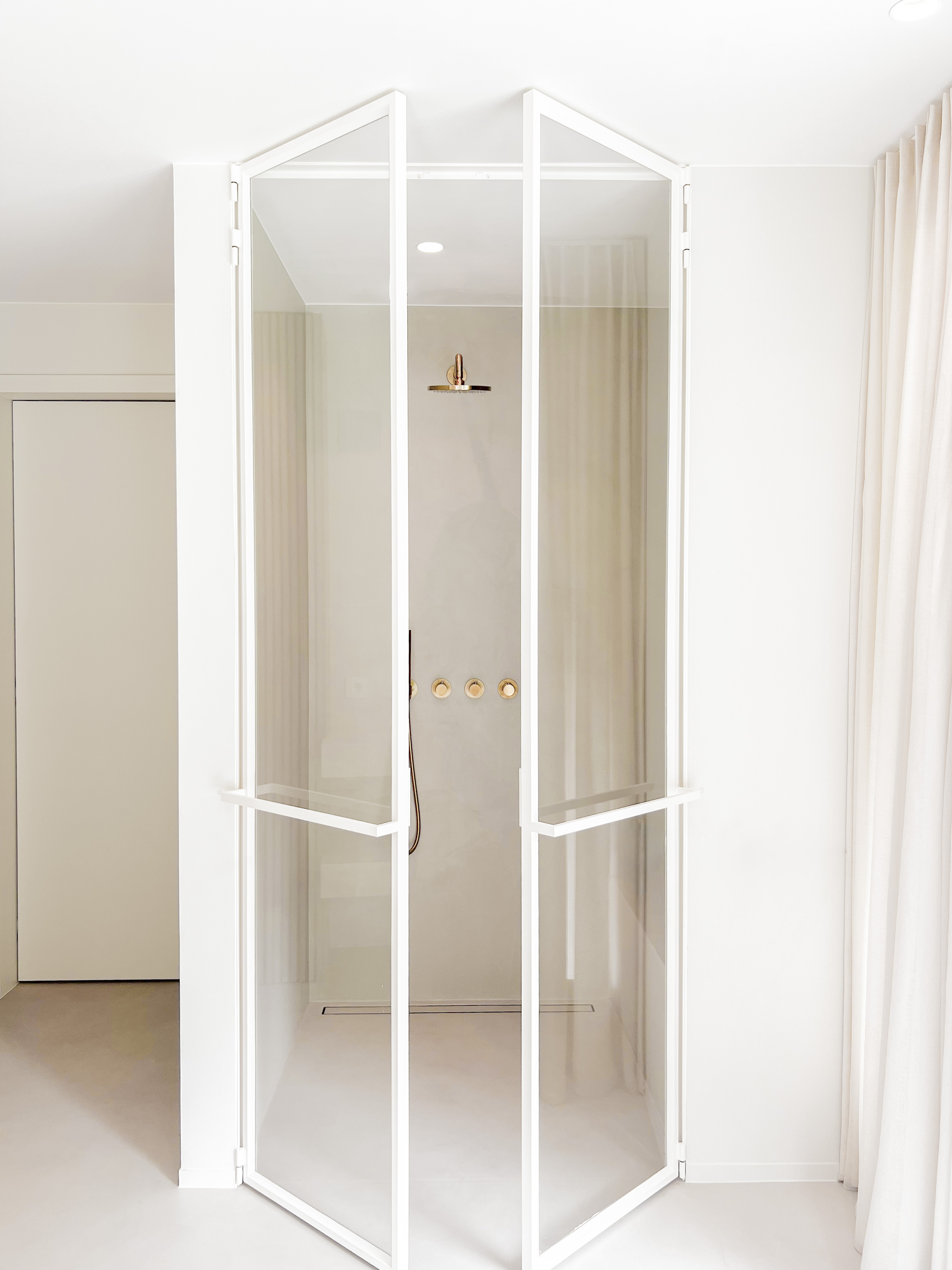 In samenwerking met Interieurcollectief hebben we een dubbele deur in de badkamer ontworpen die zowel functioneel als visueel indrukwekkend is. De deuren zijn voorzien van een subtiele beugel voor handdoeken en hebben een frisse, strakke witte afwerking.