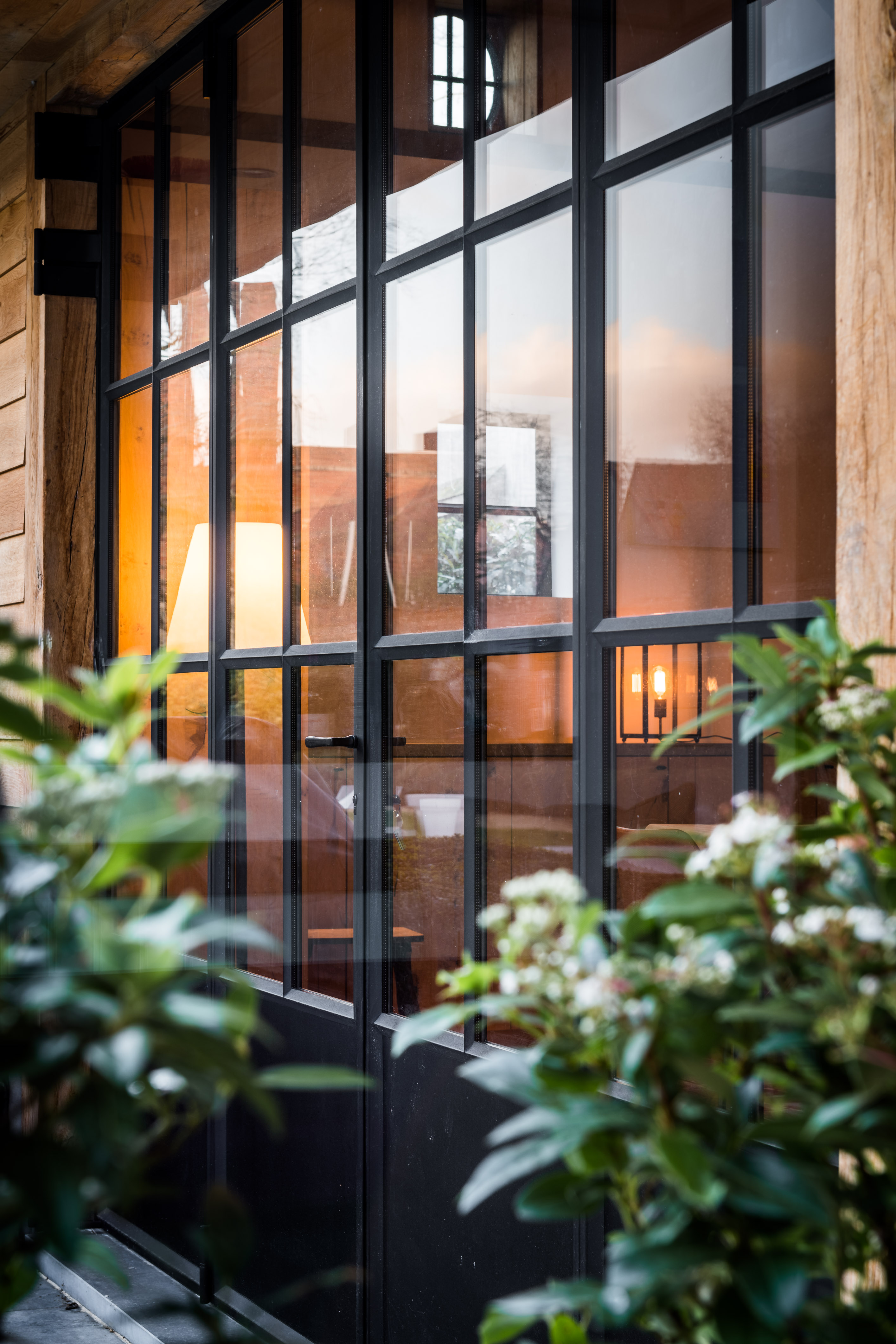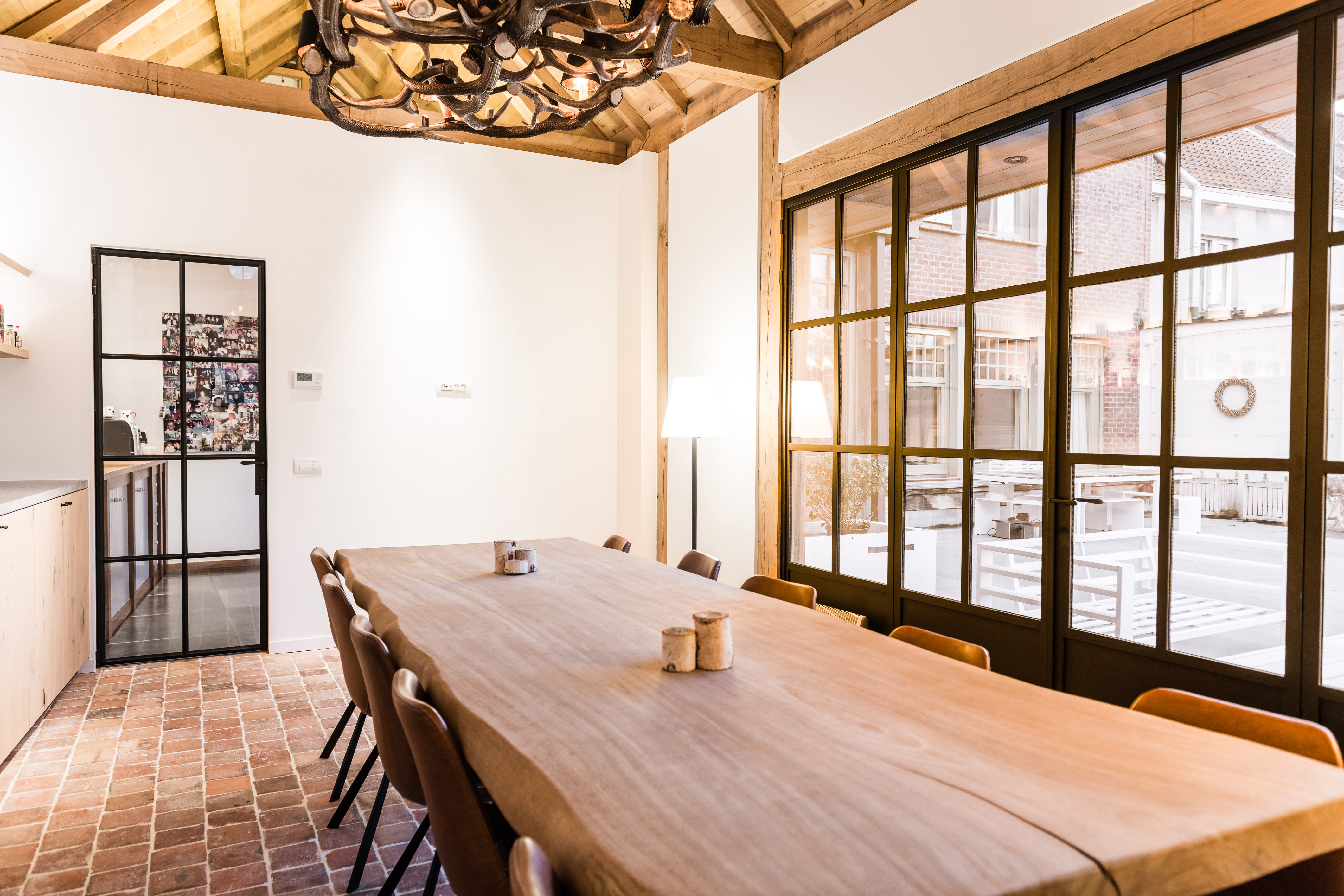 Bij deze realisatie vormen rustieke materialen en strakke lijnen een harmonieus geheel. De eiken constructie straalt een warme, landelijke charme uit, terwijl de afwerking zorgt voor een tijdloos karakter. De klassieke samenvouwende buitendeuren met dubbel glas zorgen voor veel licht en een mooie verbinding met de tuin. Binnen vervolledigt een stalen deur het geheel met een verfijnde toets.
